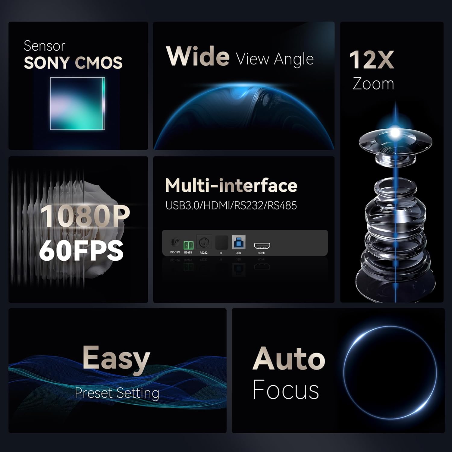 12X Optical Zoom PTZ Conference Camera USB3.0/HDMI 90° Wide View Angle