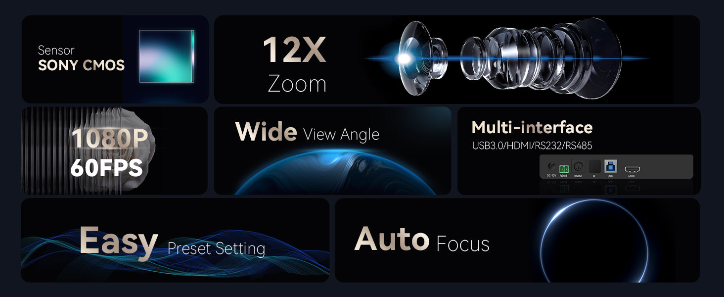 Capture every detail with a 1/2.8'' SONY CMOS sensor, 2.38MP lens, 12X optical zoom, and 90° wide field of view—perfect for lifelike meetings and events.